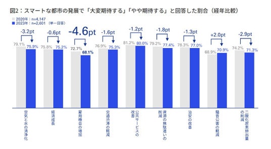 スマートな都市の発展に期待することについては、「公共サービスの改善(80.0%)」「資源の無駄遣いの削減(77.4%)」「治安の改善(77.0%)」が最も高くなっています。しかし、2020年の前回の調査結果と比較するとスマートシティへの期待は全体的に期待値が低下しています。なかでも、「雇用機会の増加」の下がり幅が大きく、前回比4.6ポイント減少しています。
