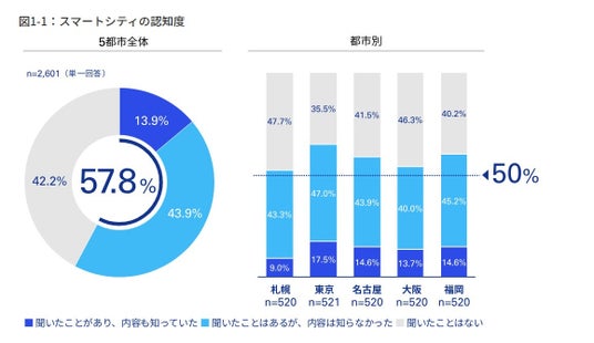 ・スマートシティという言葉を聞いたことがあると回答した割合は、5都市全体で約58%と過半数を超える。一方、内容も知っていると回答した割合は14%にとどまる。