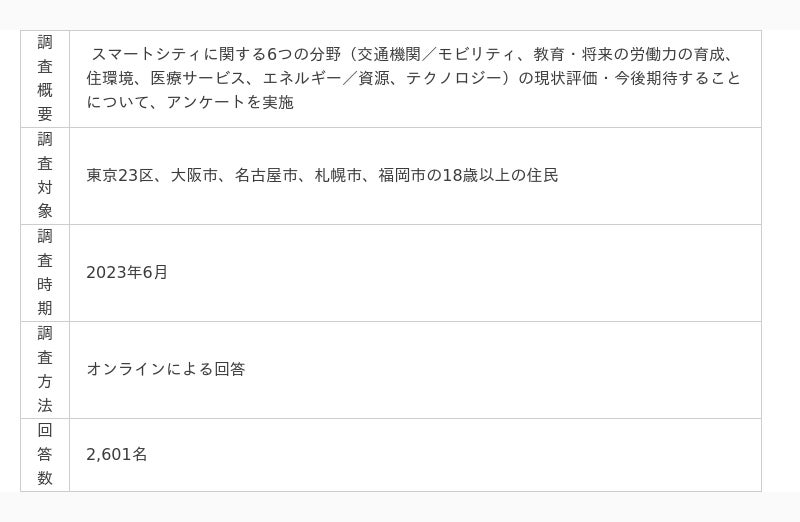 「交通機関/モビリティ」をはじめスマートシティに関する6つの分野で調査
