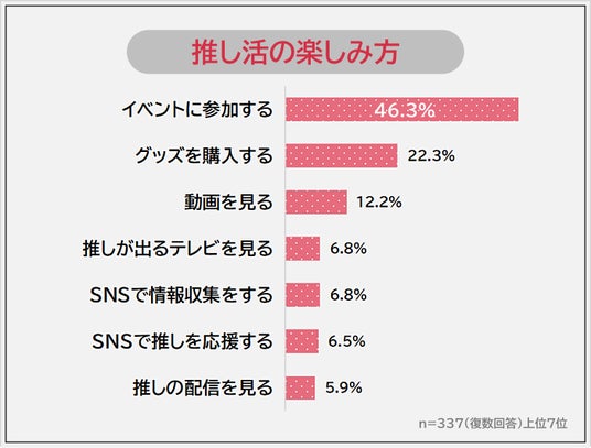 推し活の楽しみ方としては「イベントに参加する(46.3%)」がダントツ人気。「推しを直接感じられる体験が最高」と感じている人が多いようですね。