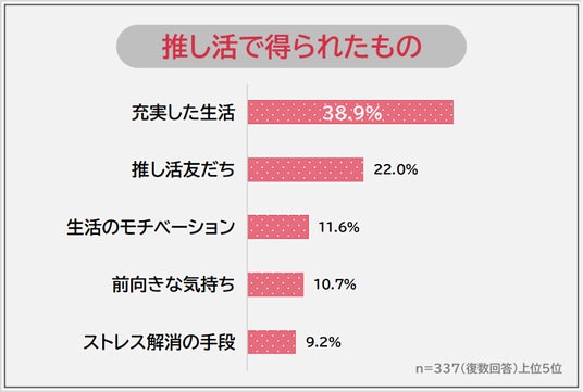 推し活で得られたものを聞いたところ、圧倒的1位は「充実した生活(38.6%)」でした。2位「推し活友だち(22.0%)」、3位「生活のモチベーション(11.6%)」が続きます。