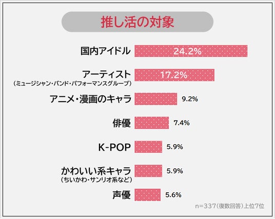 推しがいる337人に「推し活の対象」を聞いたところ、もっとも多かったのは「国内アイドル(24.2%)」、次ぐ2位はミュージシャン・バンド・パフォーマンスグループといった「アーティスト(17.2%)」でした。実在の人物を推している人が多いとわかります。