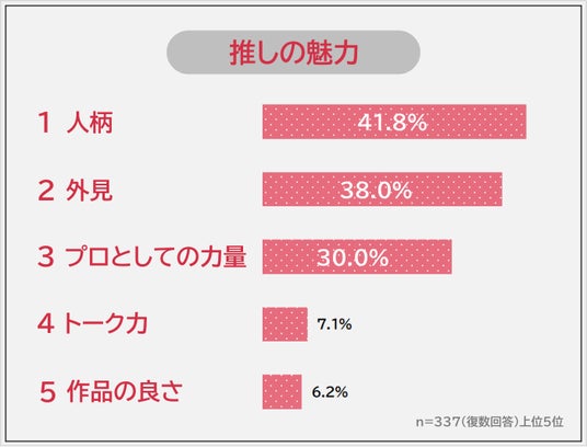 自分の推しのどこに「魅力」を感じるか聞いたところ、1位は「人柄(41.8%)」でした。2位「外見(38.0%)」、3位「プロとしての力量(30.0%)」と答えた人も多くなっています。