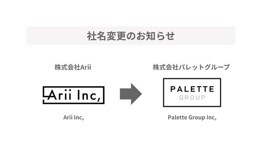 株式会社Arii(代表取締役:新井貴雄)は、社名を「株式会社パレットグループ(Palette Group Inc,)」へ変更し、同時に本社を東京都千代田区へ移転いたしました。