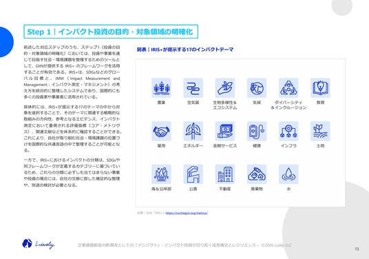 Lively合同会社(本社:東京都千代田区、Founder & CEO:種田 毅、Co-Founder & Co-CEO:三浦 友見)は、サステナブルな未来に向けたビジョンと先見力を育むことを目的としたレポート・シリーズ、第7弾となるレポート「企業価値創造の新潮流としての『インパクト』 インパクト投資が切り開く成長機会とレジリエンス」を、Livelyの公式ウェブサイトにて公開しました。