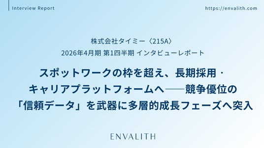 次世代型の株式リサーチ・プラットフォームを展開する株式会社エンヴァリス(本社:東京都渋谷区、代表取締役社長:河井 浩一、以下「当社」)は、株式会社タイミー(本社:東京都港区、代表取締役:小川 嶺、証券コード:215A、以下「タイミー」)の2026年4月期 第1四半期インタビューレポートを配信いたしました。