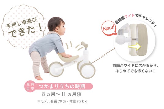 - 前輪の幅を調節でき、10ヵ月~2才まで年齢に合わせた遊びが可能