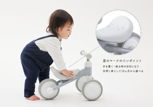 今回のコラボレーションでは「ディーバイクミニワイド」のグラフィックデザインコンセプトを、アカチャンホンポが提案。言葉を理解できない子どもでも視覚的に動作を判断できる要素として、サドルに星のマークのワンポイントをあしらい、手をそえることが子どもに伝わる工夫をしています。