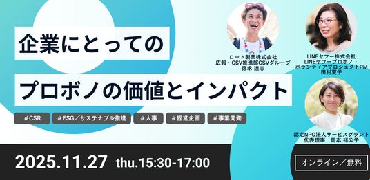 Beyonders(認定NPO法人ETIC.、ロート製薬株式会社、アビームコンサルティング株式会社、日本航空株式会社)、認定NPO法人サービスグラント、プロボ能登(LINEヤフー株式会社)は、企業におけるプロボノ※の多面的な価値とインパクトを深掘りするオンラインイベント「企業にとってのプロボノの価値とインパクト」を、2025年11月27日(木)に共同開催します。