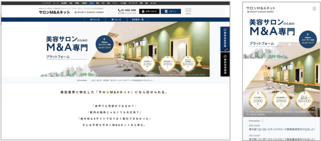 「サロンM&Aネット」は2018年9月21日のサービス開始より、完全仲介モデルとして多くの美容サロンのM&Aを支援してきました。コロナ禍において美容業界のM&Aが活況となる中、事業承継の形も大きく変化し、事業者間の直接交渉によるスピードを重視するニーズが高まっています。そのニーズを叶える機能の進化とともに、よりユーザーフレンドリーなUI/UXを目指して、この度「サロンM&Aネット」を、美容業界初の「売り手と買い手が直接交渉可能なM&Aプラットフォーム」としてリニューアルオープンいたします。また、居抜き物件を探している方が、事業譲渡やM&Aも視野に入れていることも多く、当社が運営する不動産ポータルサイト「サロン不動産ネット」と会員ID・パスワードを共通化することで、サイト間の連携を強化しました。