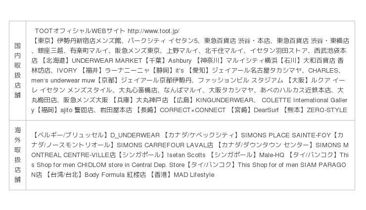 TOOTは、日本発のメンズラグジュアリー・アンダーウェアブランドです。ずっとこだわり続けた「高い耐久性」と「はき心地」は、宮崎県にある自社工場の熟練した日本人職人による繊細な縫製技術にあります。熟練された職人の情熱と愛情、そして縫製に対するプライドが、TOOTブランドの圧倒的なクオリティを支えています。確かな縫製技術と独自のファッション性、素材に対するこだわりから生まれる「はいたときの極上の体験」が、ファッション感度の高い国内外の顧客層に多く支持され続けています。