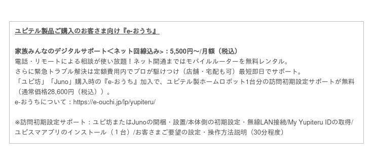 さらに「ユピ坊」「Juno」購入時に『e-おうち』への加入特典として、購入したロボット1台分の訪問初期設定サポートを行います。ユピテル製ロボットと『e-おうち』のタッグにより、「ネット環境」「本体初期設定」「日常的なデジタルのお困りごと解決」「導入後のトラブル対応」まで、ワンストップサポートが可能となります。デジタルに苦手意識がある方、離れて暮らす高齢のご家族の見守りにロボット購入を検討されるお客さまにとって手間なく、安心してロボットとの新生活を迎えるサポートを両社で拡充します。