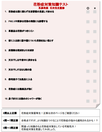 耳鼻科医 石井先生監修 隠れ花粉症 簡易チェックシート・花粉症対策知識テスト