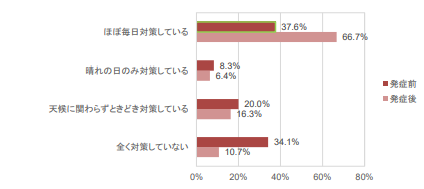 花粉症に悩んでいる方に、花粉症の発症前と発症後の対策頻度について聞いてみました。その結果、発症前に 「ほぼ毎日対策」する方は4割に留まることが分かりました。また、効果を実感した対策方法については、最も多 かったのが「マスクをつける」の7割、続いて「抗アレルギー薬を服用する」の6割でした。