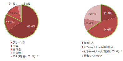 コロナ禍ではじまったマスク着用の効果を調べるため、使用しているマスクの形状を聞きました。その結果、最も多かったのは「プリーツ型」で7割、続いて「平方」が2割でした。また、マスクの種類に関わらず、7割がマスク着用で花粉症の症状が緩和されたと答えました。