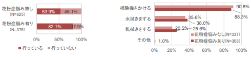 その他の花粉症対策について聞いてみました。部屋の掃除方法として最も多かったのは、「掃除機をかける」、続 いて「水拭きをする」でした。