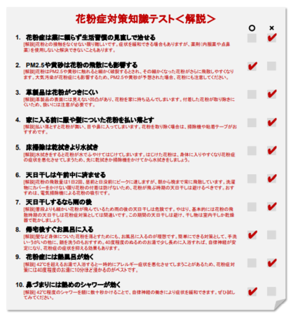この10項目で間違えた項目があった方は、その対策について、よくお読みください。今後の花粉症対策にとても役立つと思います。