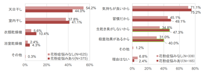 花粉が舞う季節、特に気をつけたいのは洗濯物への花粉の付着です。洗濯物の干し方として「天日干し」を選ぶ方 が多く、その理由は「気持ちが良いから」が最も多い回答でした。また、花粉症に悩む方でも、臭いの軽減や殺菌 効果からやむを得ず天日干しを選んでいることが分かりました。