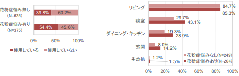 スギ花粉は水を含むとふやけて、中身が弾けて飛び出します。この中身がアレルギー反応を強く起こす物質のた め、水拭きはかえって花粉症の症状を悪くします。空気清浄機は、花粉が入り込む可能性の高い玄関がおすすめ です。その次に大切な場所はリビングの窓際です。衣類を手で叩くと、花粉が飛び散ってしまいます。原則はアウ ターは玄関で脱ぎ、部屋に持ち込まないことが大切です。