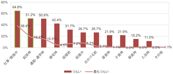 早朝や日中に花粉症の症状に悩まされる方も多いのではないでしょうか。花粉症に悩みを感じていると回答され た方に、一日の中で花粉症がつらいと感じるタイミングを聞きました。その結果、つらいと感じるタイミングは6割が「仕事・勉強中」、続いて5割が「起床時」でした。