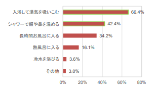 花粉症対策としてお風呂に入ると答えた方にお風呂の入り方についてきいてみました。その結果、「入浴して湯気 を吸いこむ」と答えた方が7割と最も多く、「シャワーで額や鼻を温める」方が4割いることが判明しました。