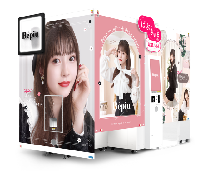本作『Bépiu.(ベピウ)』は業界初のプリントシール機「プリント倶楽部(R)」で一世を風靡したセガによる、最新のプリクラ機です。Z世代を中心に注目されているファッションテイスト「フレンチガーリー」をテーマに、うるうるした瞳、ほどよいツヤでほわっとした肌、きゅっとしたフェイスライン、さらさらしたツヤ髪が特徴の、オトナっぽベビーフェイス“ばぶきゅる盛り”が楽しめます。