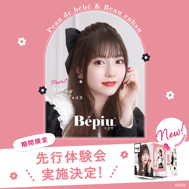 株式会社セガ(本社:東京都品川区、代表取締役社長COO:杉野行雄、以下 セガ)は、最新プリクラ機『Bepiu.(ベピウ)』を発表いたします。また、全国稼働に先駆けていち早くプレイできる先行体験会を期間限定で実施いたします。
