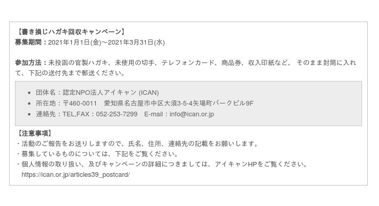 ×募集していないもの:投函済のハガキ(一度投函して戻ってきたものも含む)、官製ハガキではないハガキ(切手を貼る必要がある絵葉書等)、使用済切手等