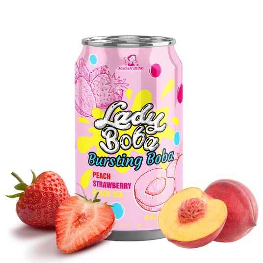 Lady Boba ポッピングボバ入り台湾フルーツティは、台湾のMadam hong社による製品で台湾の伝統的なお茶や紅茶をベースにしたさっぱりとしたフルーツティに、ポッピングボバ(POPPING BOBA )が入ったユニークなドリンク。ポッピングボバとはタピオカのような見た目でとてもやわらかく、噛むと口の中で弾け、ポッピングボバの中に含まれた爽やかなフルーツティが口いっぱいに広がります。宝石のようにキラキラした粒でプチプチとした食感が楽しい「新感覚のスイーツ、食べるジュース」とも言われています。台湾・韓国・欧米で大人気です。