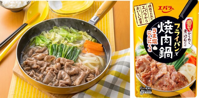 「フライパンで焼肉鍋」は、フライパンで肉を焼いてから野菜と煮込むだけの手軽さで、焼いた肉の香ばしさと肉のうまみが染み出たおいしさを存分に楽しむことができる鍋つゆです。ラインアップはうま辛いコチュジャンにニンニクを合わせた「コチュジャン醤油味」と、ごま油とニンニクの風味にレモン果汁を合わせた「うま塩にんにく味」の2品。キャベツやタマネギなど、冷蔵庫に常備してある野菜と肉だけで手軽に作れて、ごはんが進む鍋料理の提案を推し進めます。