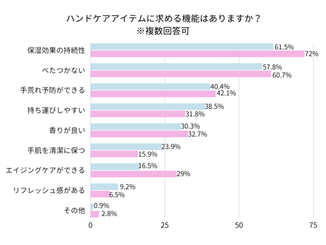 またハンドケアアイテムに求める機能を世代毎に見てみると、乾燥と手荒れの予防に関係する「保湿効果の持続性」と「手荒れ予防ができる」がどちらの世代も1、3番目にランクインしました。