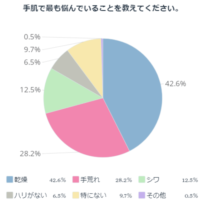 約4割が「乾燥」、約3割が「手荒れ」といった手肌に現れる症状に悩まれており、次いで「シワ」といった手肌の見た目にも悩まれていることが分かりました。