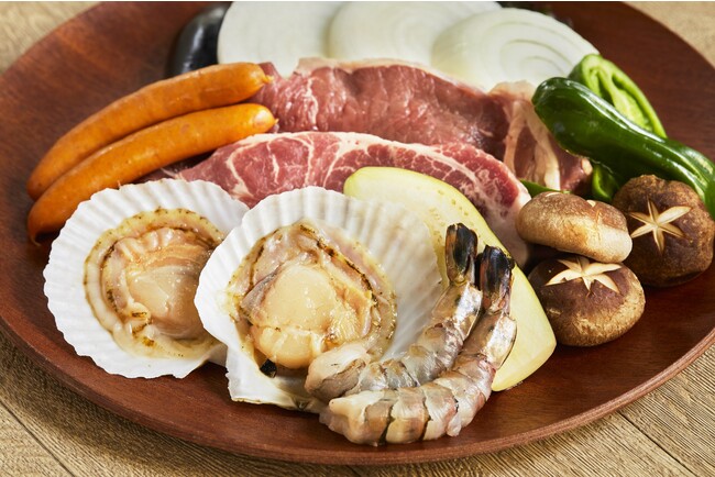 BBQテラスでは、牛ロースや豚肩ロース、帆立や海老などを揃えたBBQプレート(3,300円)をご用意。グリルで自由に食材を焼いて、気軽にバーベキューをお楽しみください。