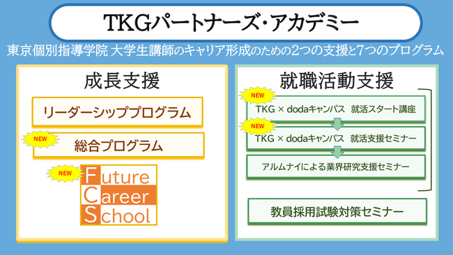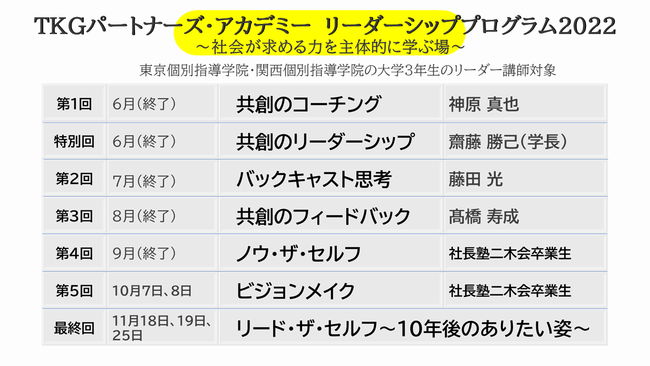 1万人超の大学生アルバイト講師を大切なパートナーと捉える東京個別指導学院は、人財育成機関「TKGパートナーズ・アカデミー」を3年生が本格的に就職活動に取り組む9月に本格稼働し、【社会が求める力=社会人基礎力を主体的に学ぶ機会】を提供することで講師のファーストキャリア形成を多面的に支援します。