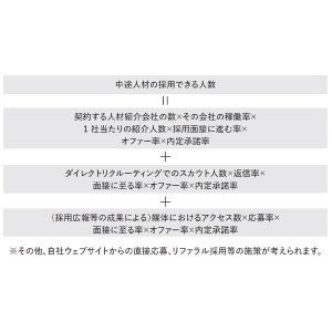 「業務を分解して、施策を考える」という考え方は採用にも適用できます。分解ができたら、「どの因数をあげるべきか」を自社の戦略や目的と、アップサイド(とコストやリスク)の観点から、優先順位を決めましょう。例えば、中途人材の採用人数を確保したければ、計算式は図のようになります。