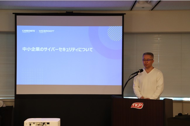 当日は、株式会社サイバーディフェンス研究所 専務理事 上級分析官の名和利男氏をお招きし、ウェブルートのシニアマーケティングマネージャー 丹羽史明とともに中小企業のサイバーセキュリティについてプレゼンテーションを行いました。
