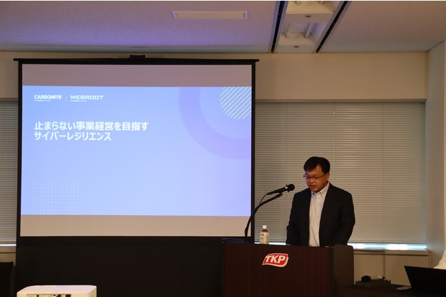 「企業がセキュリティ対策を考えるにあたって、我々が皆様にお伝えしたいのは、サイバー攻撃に起因する被害・損壊、予期せぬ出費を出さないために企業はサイバー攻撃の被害に遭うという前提で事前の準備が必要ということです。いまや1つのセキュリティ製品やソリューションで全てのサイバー攻撃を防ぐことは残念ながら難しいと言わざるを得ません。しかし、企業として考えなければいけないことは、サイバー攻撃の被害にあっても最小限の被害に食い止め、事業の継続を止めないことに注力すべきであるということです。これを我々はサイバーレジリエンスと呼んでいます。ウェブルートのサイバーレジリエンスは、単なる言葉だけでなく、それに基づいて製品を開発から販売させていただいています。メッセージと販売しているソリューションが一体となっているところが大きな特徴となっています。」