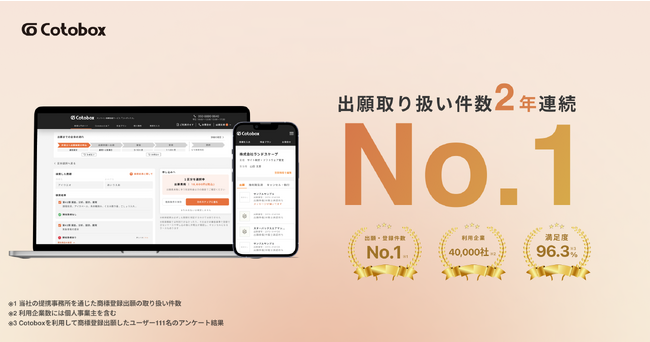 cotobox株式会社(本社:東京都千代田区、代表取締役:五味 和泰)が提供するオンライン商標登録サービス「Cotobox(コトボックス)」の、特許庁への出願取扱件数が、2年連続で国内1位(※1)を記録したことをお知らせします。