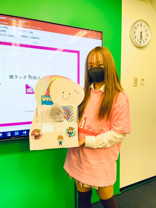 今回、グッズをプロデュースしたのは本校1年生の田川さん。InstagramやTikTokでは「オタクの全てを理解するJKあゆたん」として、推し活をしている方々にインタビューする動画を投稿し、売れるグッズを研究する”推し活マーケティング活動”を日々行っています。