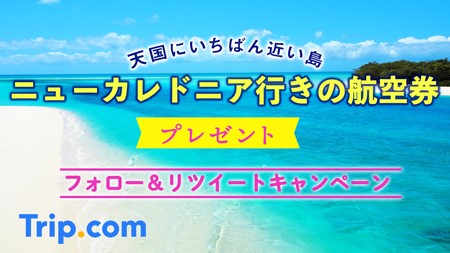 今回Trip.comでは、お客様へ日頃の感謝を込め、ニューカレドニア行き路線を運航している「エアカラン(エア・カレドニア・インターナショナル)」とコラボした、ツイッターキャンペーンを10月31日までの期間限定で実施中。ツイッターでTrip.comの公式アカウントをフォローし、本キャンペーンツイートをリツイートしていただいた方のなかから、抽選で1名様に成田発ニューカレドニア行のペア航空券をプレゼントします。ぜひこの機会に、天国にいちばん近い島と呼ばれるニューカレドニアに出かけてみてはいかがでしょうか。