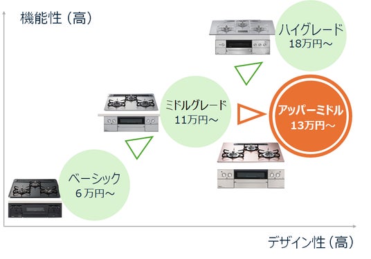 ガスコンロは大きく3グレードに分かれます。必要最低限の機能を持ったベーシックグレード(6万円~)、高機能なグリルやガラス製の天板を備えたミドルグレード(11万円~)、そして最先端機能をふんだんに盛り込んだハイグレード(18万円~)です※。その中で昨今売上を伸ばすのが、豊富なカラー展開をしたり、光沢感のある素材を使ったワンランク上のミドルグレードです。
