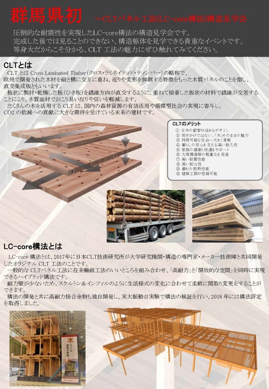 群馬県におけるCLTパネル工法(LC-core構法)を用いた建築物の構造見学会としては初の試みとなります。本見学会では、建て方直後の状態でしか見ることができない構造体が露出した状態を実際にご覧いただけます。CLT建築の魅力を等身大でご体感いただけるこの見学会に、ぜひご参加ください。