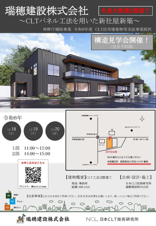 ライフデザイン・カバヤ株式会社(代表取締役社長:窪田健太郎/本社:岡山県岡山市)が運営する、CLTフランチャイズネットワーク本部『日本CLT技術研究所』は、加盟企業である瑞穂建設株式会社(代表取締役:篠原玄洋/本社:群馬県渋川市)が現在建築中であるCLTパネル工法を用いた新社屋において、2024年12月18日(水)~20日(金)の3日間、完全予約制にて構造現場見学会を開催いたします。