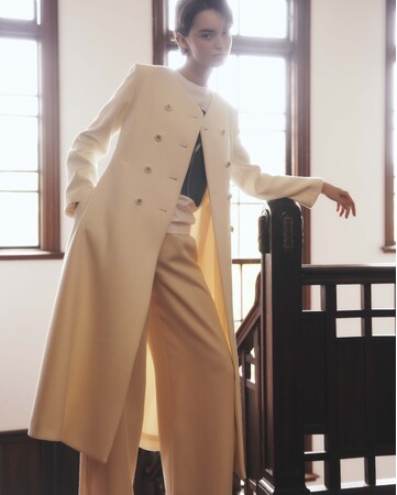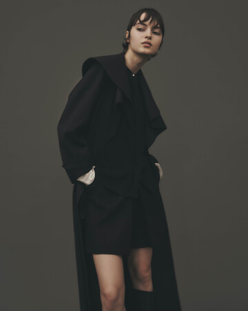 程よい張り感と光沢を兼ね備えたウール100%の素材を使用したカスケードドレスコート。大きなラッフルを襟元にデザインして華やかさを添え、ウエストのタックを中縫いすることで美しいシルエットに仕上げました。フェミニンさとモード感のある新しいドレスコートです。
