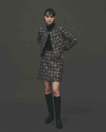 “MALHIA KENT”のジャガード生地を使用したセットアップスタイリング。ふんだんに使われたラメ糸は華やかでゴージャスさを演出します。格子状に白い衣装糸が入っており、全体にはチェック柄にも見えます。その生地の中に可愛らしい花モチーフが入っており、細部にわたって装飾された生地です。華やかなシーンはもちろんデニムやニットと合わせてデイリーに着こなし、上質なカジュアルスタイルを楽しむのもおすすめ。