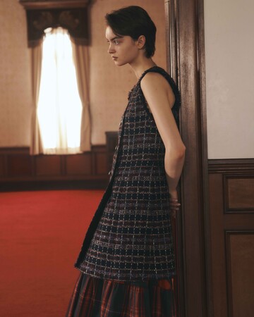 フランスのテキスタイルメーカー“MALHIA KENT(マリアケント)”の上質なツイードを使用したワンピース。ネイビーベースにゴールドとレッドの衣装糸でチェック状に織られています。ウエストをシェイプさせ、短めの着丈でコンパクトに仕上げたトレンドのジャンパースカートデザインです。オリジナルプリントのティアードスカートと合わせたトラッドスタイルを楽しんで。