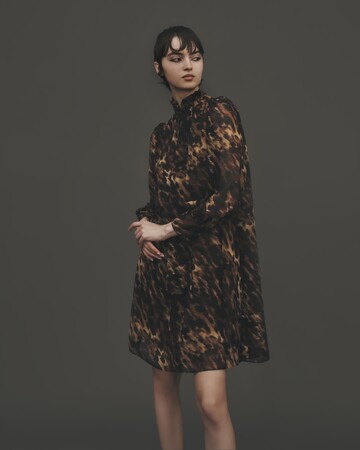 深みのある色合いにぼかしたピンク系のカラーを合わせたフェミニンな色使いがポイントなAラインのレオパードプリントワンピース。フリルネックやパフスリーブといったレディなデザインに仕上げています。ネックのリボンタイはあえて結ばずたなびかせてY2Kに流行した70年代風に。コンパクトな丈感なので、ロングコートやカーディガンと合わせてバランスを楽しんで。