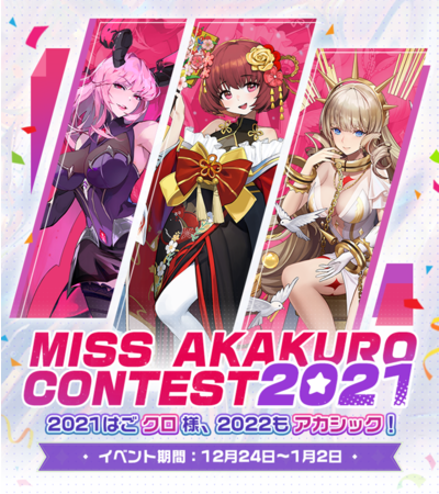 2021年12月24日より、年末記念で「MISS AKAKURO CONTEST 2021」人気総選挙を開催いたします。今年はアンジェラ(コスプレ:火将ロシエル)、グィネヴィア(コスプレ:都美)とアリス(コスプレ:山吹りょう)という3名のヒーロー選手の出場です。