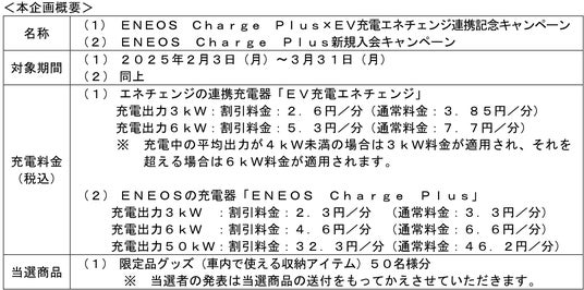 ※3 (1)ENEOS Charge Plus×EV充電エネチェンジ連携記念キャンペーン:https://www.eneos.co.jp/chargeplus/campaign/collabo2502 (2)ENEOS Charge Plus新規入会キャンペーン:https://www.eneos.co.jp/chargeplus/campaign/join2502