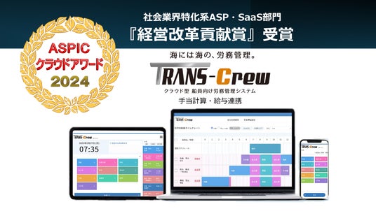 株式会社エイ・アイ・エス(本社:東京都千代田区 代表取締役:大浦博 以下:AIS)は、 船員向け労務管理(アプリ)システム『TRANS-Crew(トランスクルー)』(以下、『TRANS-Crew』)が、 一般社団法人日本クラウド産業協会(以下、ASPIC)が2024年11月20日に発表した「第18回ASPICクラウドアワード2024」の 「社会業界特化系ASP・SaaS部門」において、『経営改革貢献賞』を受賞したことをお知らせいたします。